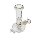 A BEAKER BONG IS DEFINED BY A WIDE FLARED BASE WHICH TAPERS UP INTO A STRAIGHT NECK. THIS DESIGN MIMICS THE SHAPE OF AN ERLENMEYER FLASK, A BEAKER DESIGNED TO MAXIMIZE THE VOLUME AND SURFACE AREA IN THE BOTTOM OF THE CHAMBER.